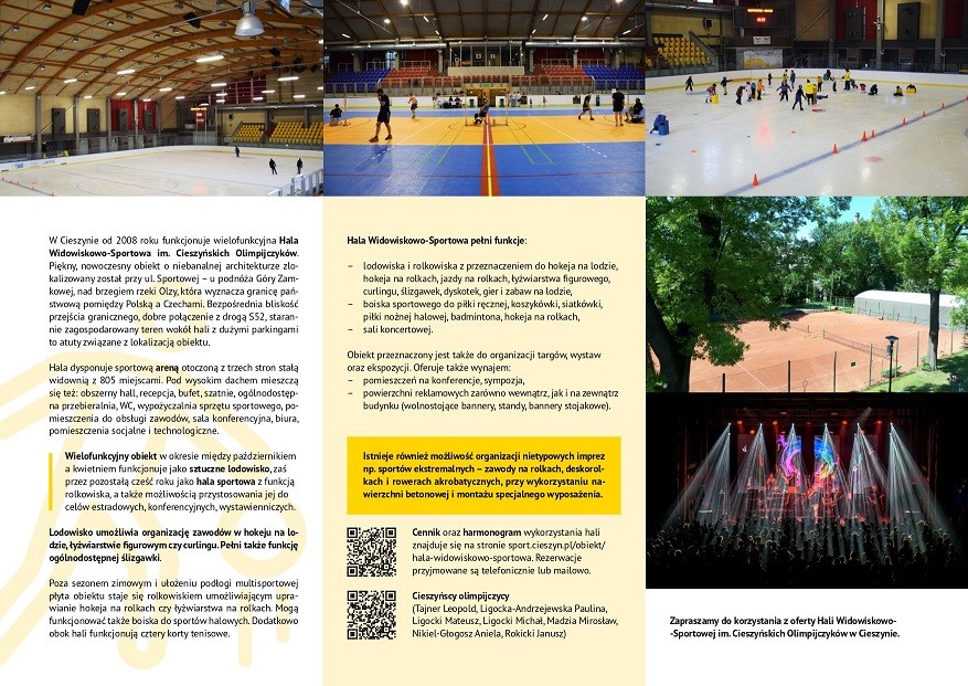 • lodowiska i rolkowiska o wymiarach 30 x 60 metrów z przeznaczeniem do hokeja na lodzie, hokeja na rolkach, jazdy na rolkach, short-tracku, łyżwiarstwa figurowego, curlingu, ślizgawek, dyskotek, gier i zabaw na lodzie.